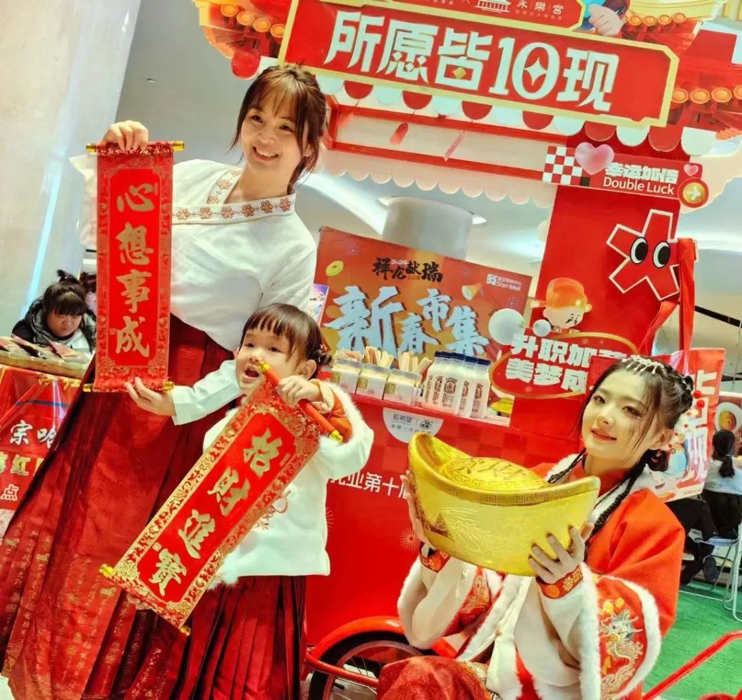 有的商场还邀请身着新年汉服的模特儿和消费者积极互动,俨然是“龙年气氛组”,为商场更添喜庆氛围。