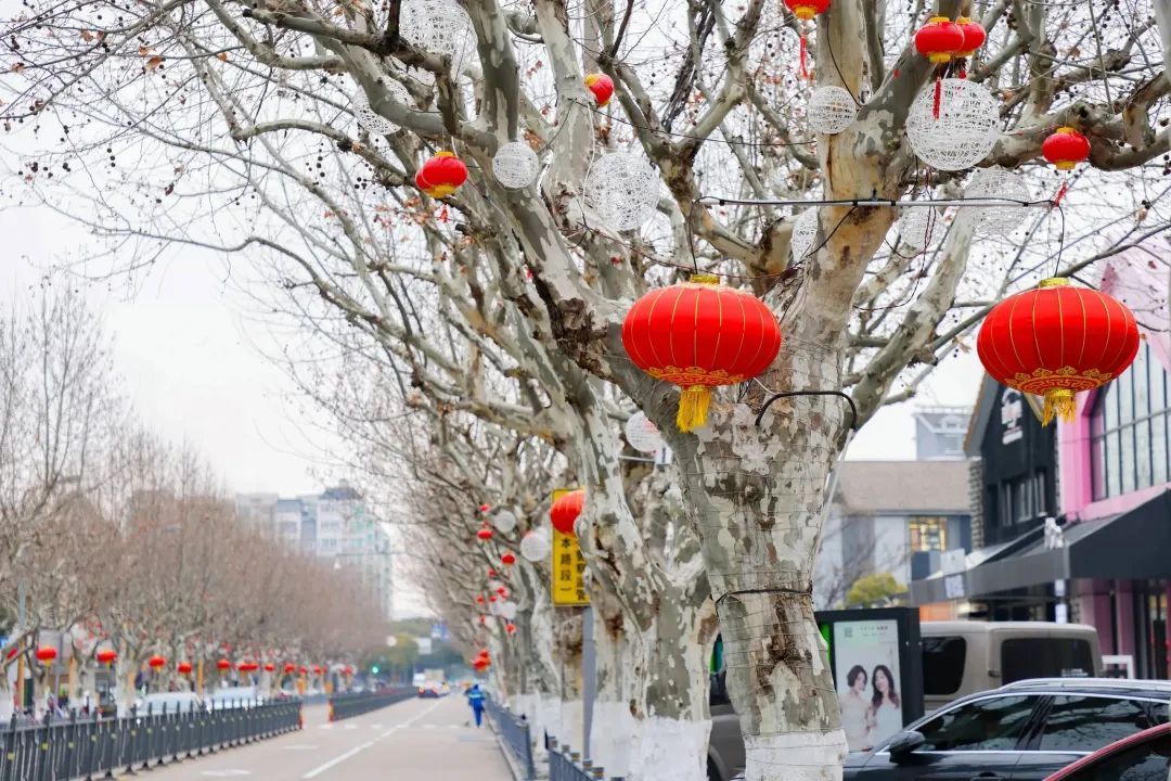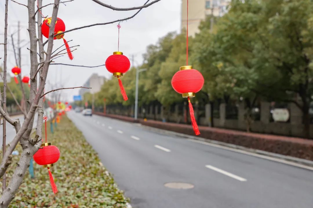 公园里、道路旁,挂起了红彤彤的中国结和红灯笼,各式灯箱贴和广告牌也焕然一新,在提升市容市貌的同时,也让整个街道“靓起来”,年味儿“浓起来”。在2022年度上海市第一批精品道路平南路(虹梅路—万源路)上,树枝上的红色灯笼随风摇曳,换上了新年的“红装”……