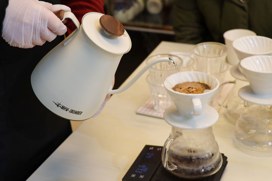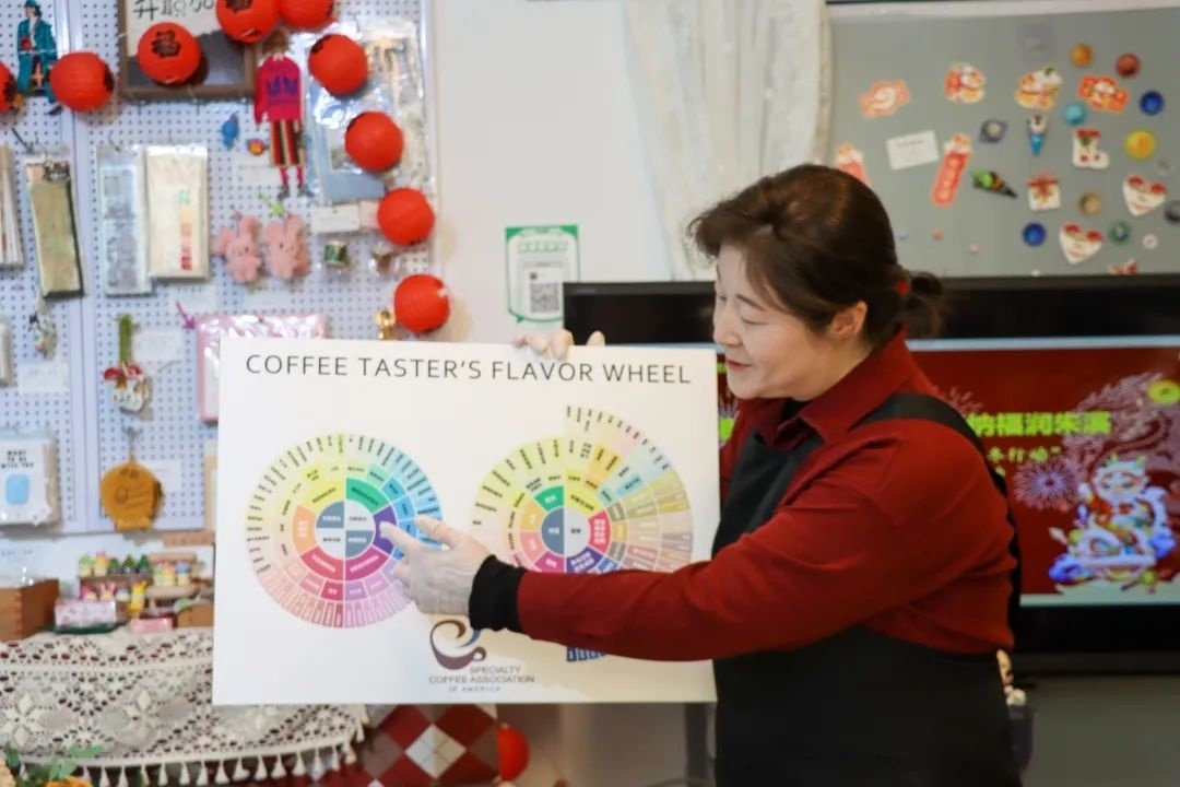 芳香咖啡课堂上,学员们围桌而坐,授课老师向学员们展示了手冲咖啡的过程,并通过咖啡风味轮让学员们熟悉和了解咖啡中可能会出现的风味,大家一起边品咖啡边学技巧。感兴趣的学员还亲手体验了手冲咖啡,学员李敏告诉记者,虽然平时也经常会喝咖啡,但这还是第一次接触手冲咖啡,收获颇多。