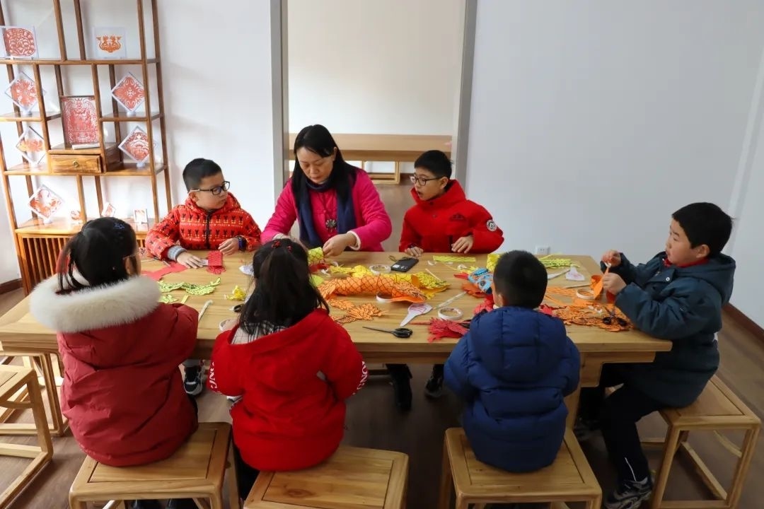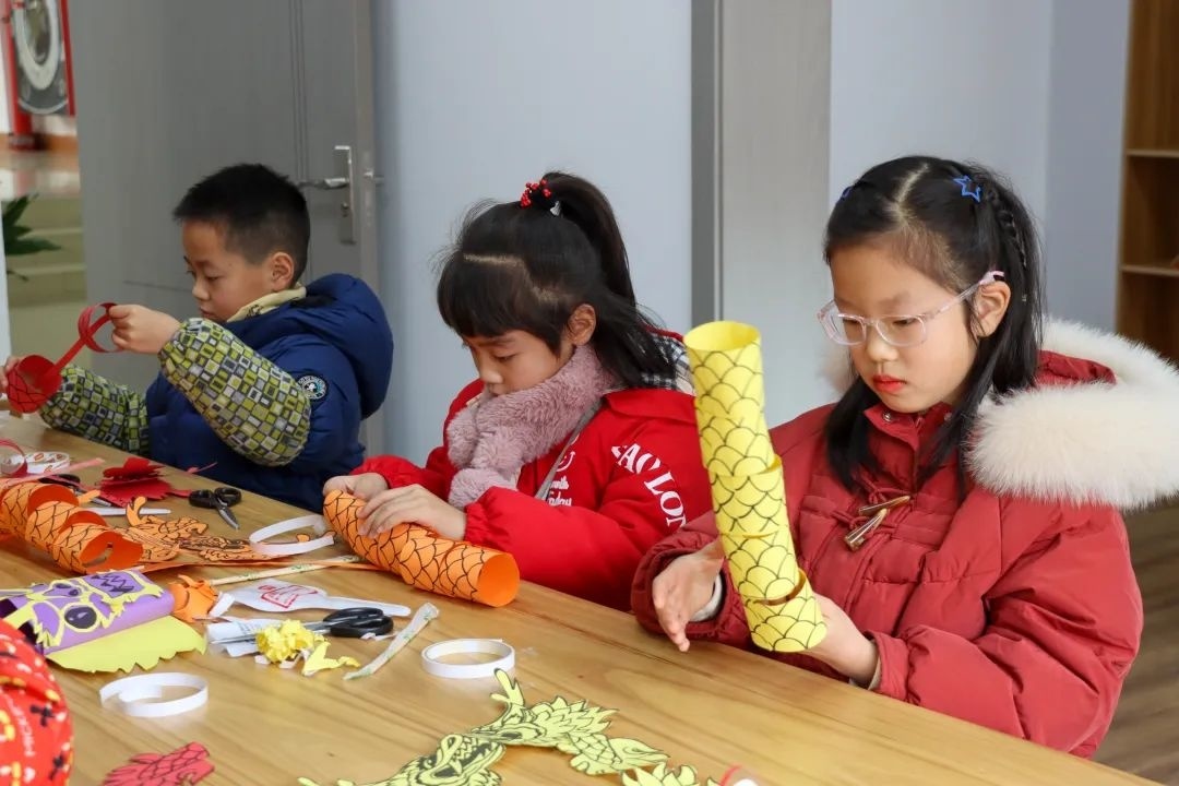 而在另一边的巧手工艺坊,小朋友们在朱泾花灯会非遗传承人的教授下,学着用彩纸制作龙灯。不少学生表示,春节期间能在家门口体验到这样的民俗文化花灯课程,觉得特别开心。