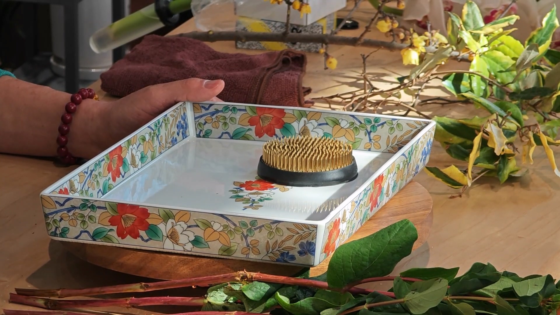 在制作家庭花艺时,首先要考虑应季的花材和适合的容器,今天我们将用到花材主要为:腊梅枝、大花慧兰、澳梅、金丝桃果(红豆)、鸟巢叶。容器的选择可以选用家中的餐具或其他器皿,只要保证外形适配和便于观赏即可,梁老师今天选用的是一个方形陶瓷鱼盆。同时我们还需要一枚插花器,也就是我们常说的“花插”,在日本被称为“剑山”。