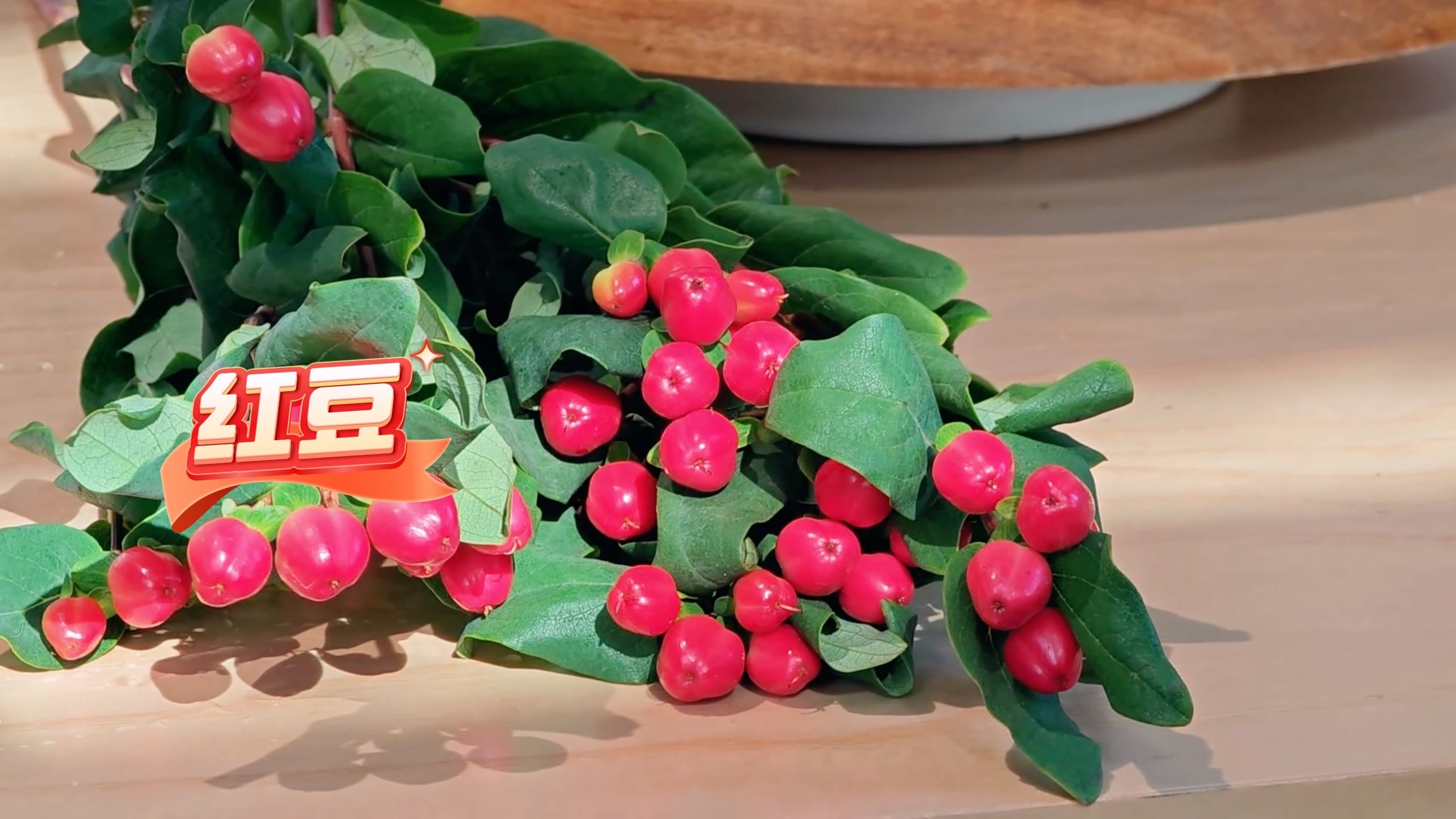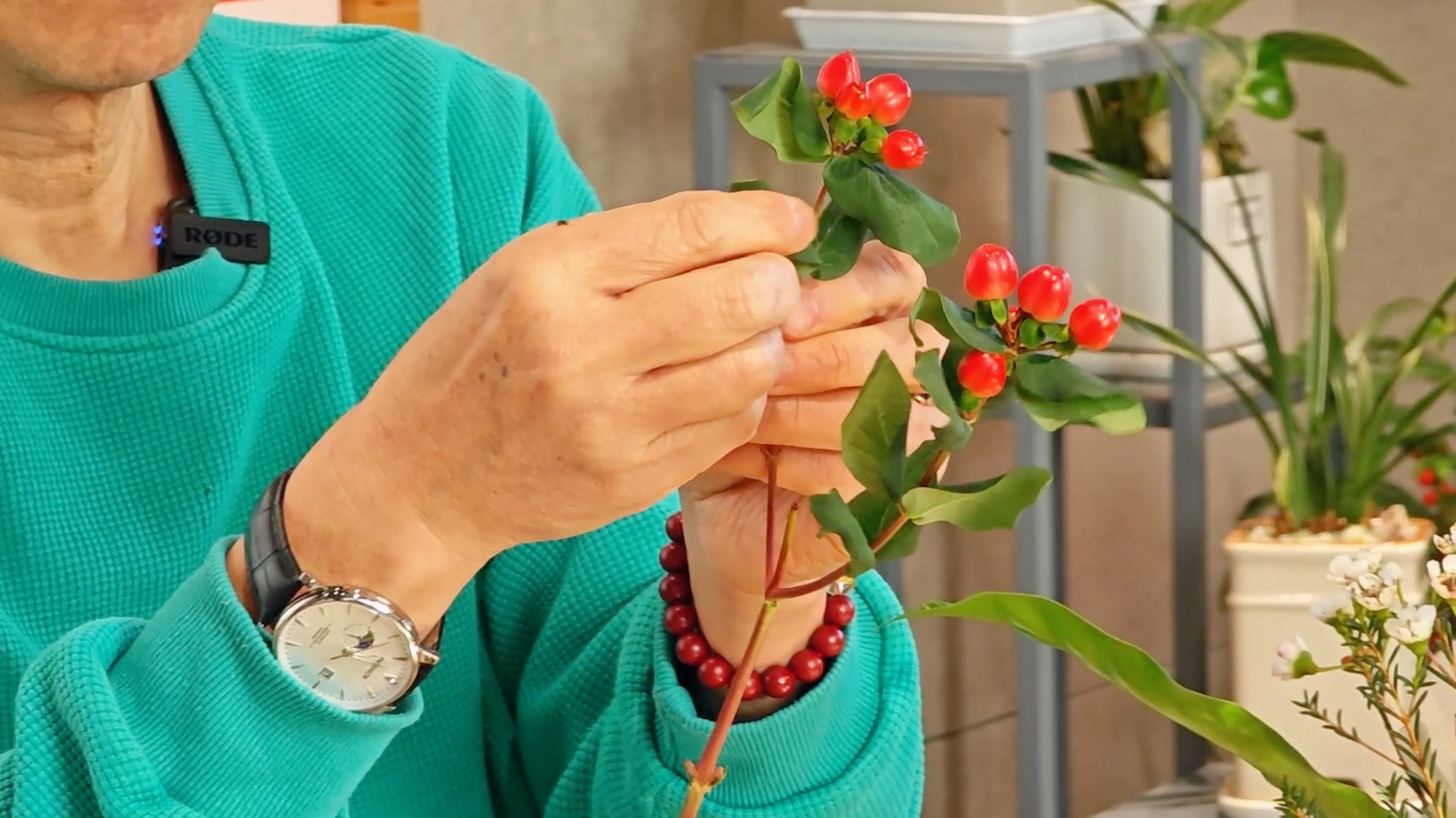 接下来是金丝桃果,也叫做红豆,插花时保留的长度要高过大花蕙兰,并去掉多余叶片。最后,我们也可插入山茶花或珊瑚叶,作为补充。插花完成后,要及时向容器内加水,水量一定要没过插花器。