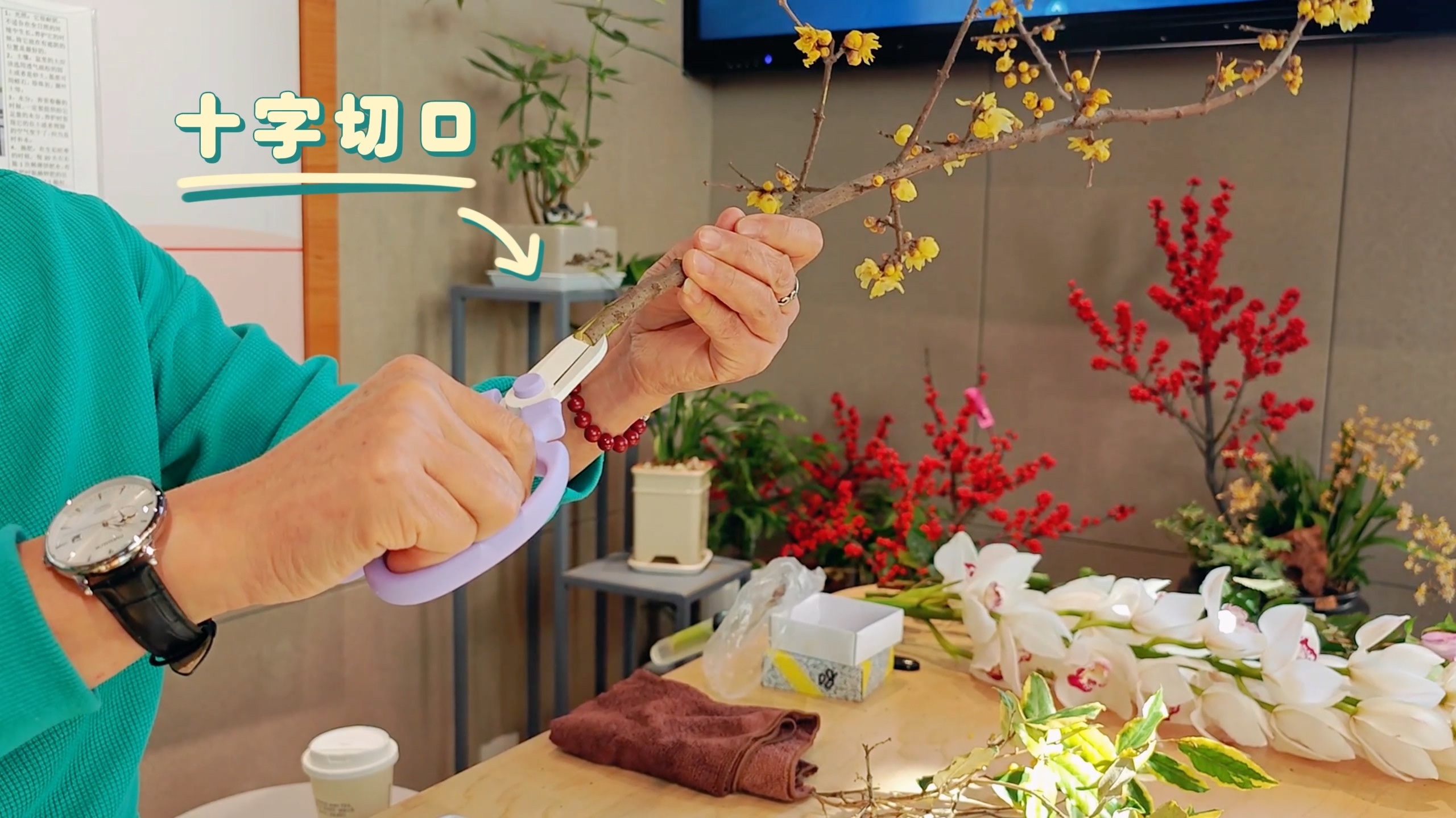 我们首先将插花器放在盆中1/4处,选取一支腊梅作为主枝,选择腊梅时要注意挑选上轻下重、上散下垂的花材。插花前先将有病虫害的枝条、交叉的枝条、以及发育不充分的徒长枝剪去,切口要平整。在留下最具观赏性的枝条后,我们在腊梅枝最底部剪出一个十字口,方便固定。