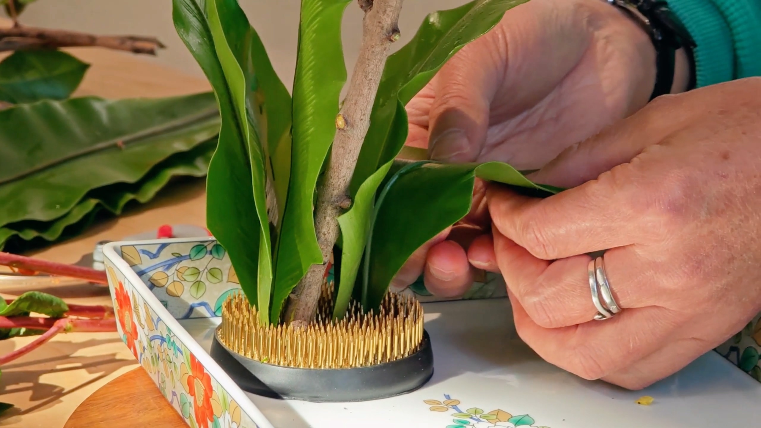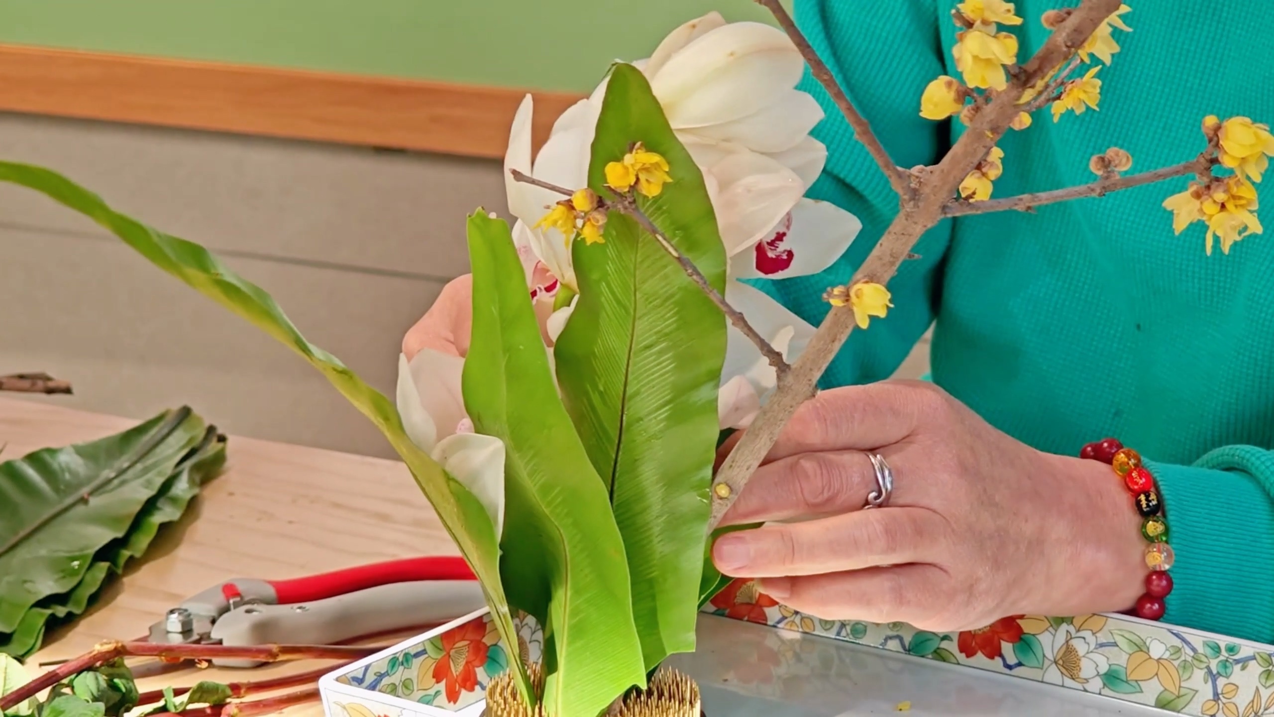 插入叶片前,我们将叶片底部的切口剪成自然生长的样子,便于固定。在腊梅左右插入五至六片鸟巢叶后,我们再剪取六至八朵大花蕙兰插在腊梅后方。随后剪取多枝澳梅点缀在外围。