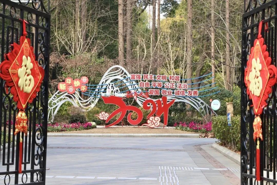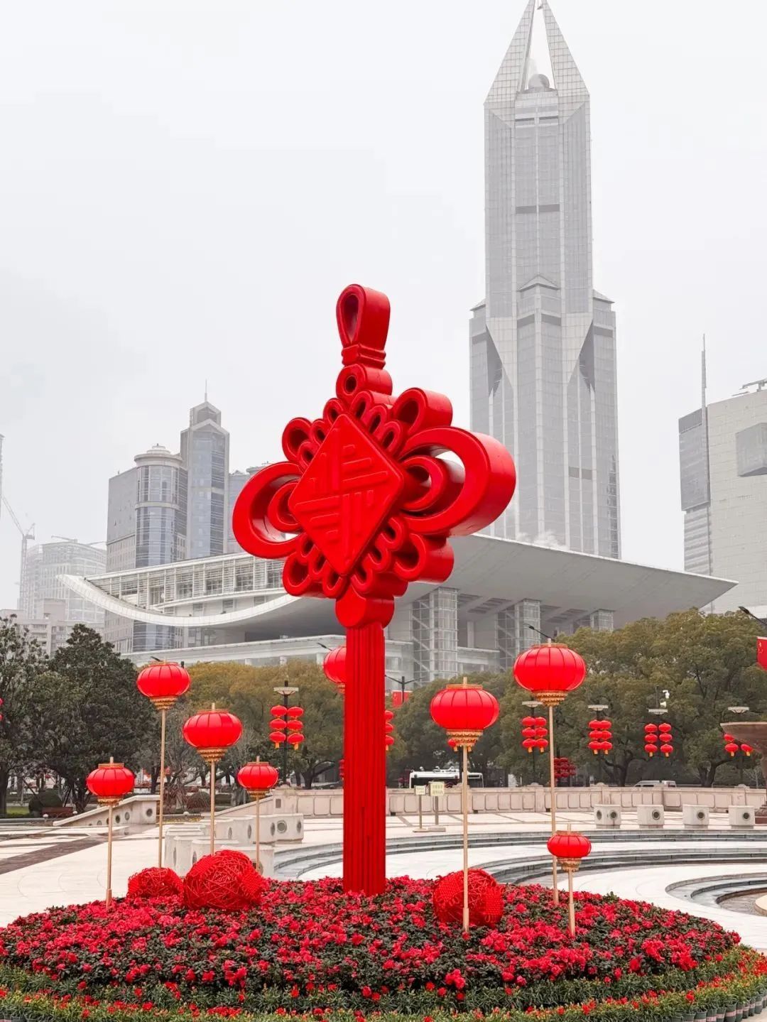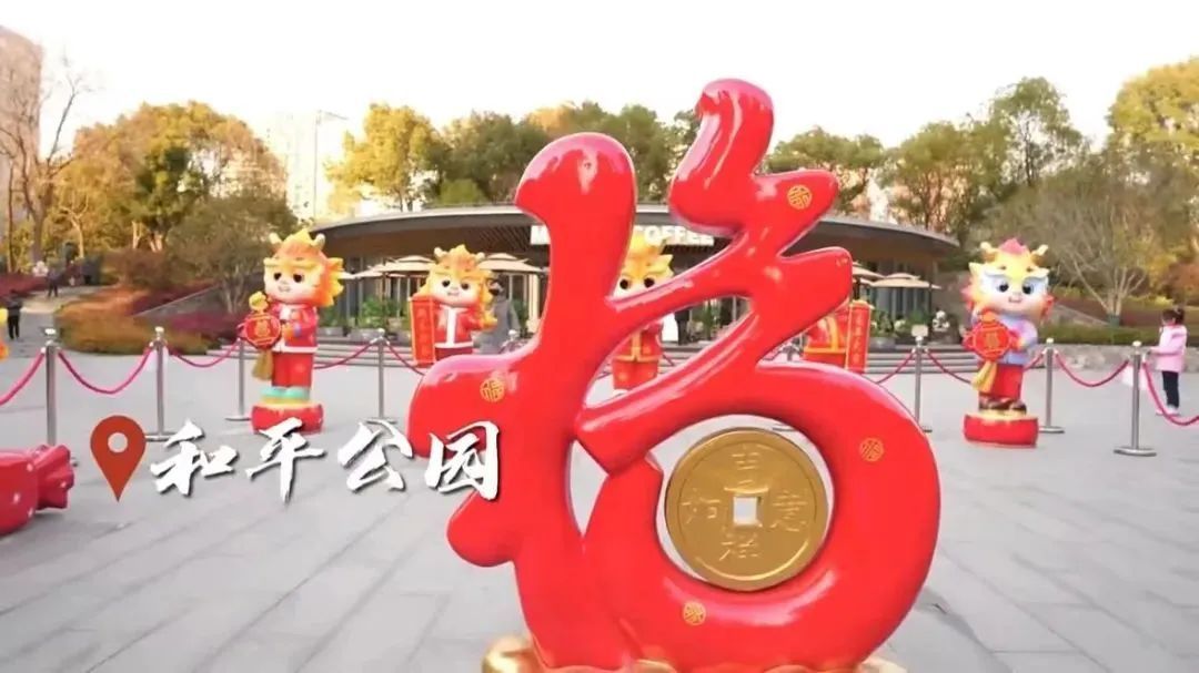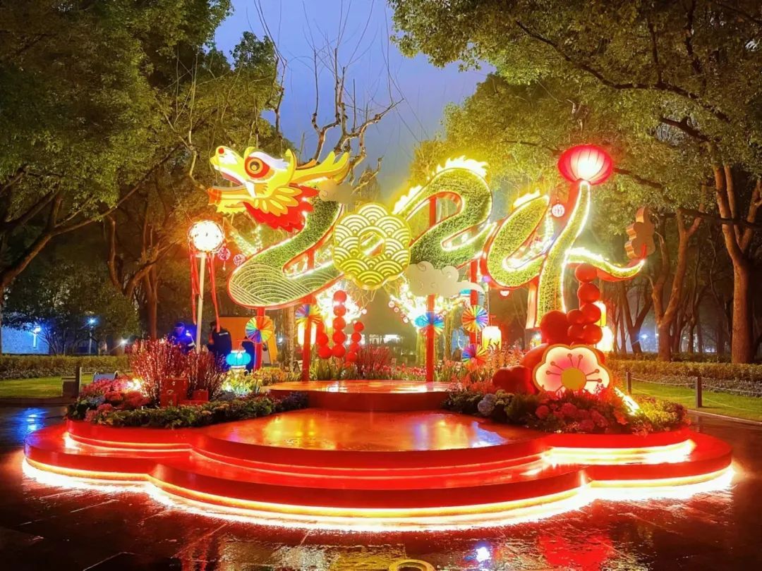 公园门前身穿唐装的“迎福小龙”传递了新春的祝福和美好的愿景,广场挂满了中国传统的“福”字灯笼,象征点亮万家灯火、福暖四季,也营造了喜庆的新春气氛。