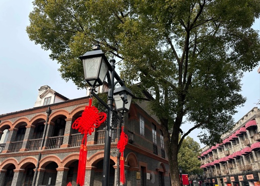 鲜红耀眼的中国结交织着百年多伦路的文化脉络,衬托出多伦路厚重的人文历史气息,寓意着这里的百年风华永不褪色