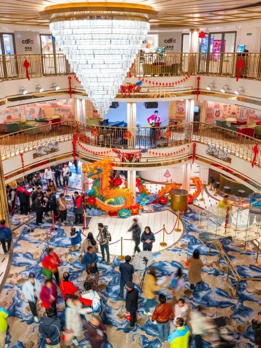 游客金先生一家四口在船上共度春节假期,他表示:“春节期间船上的年味很足,各类民俗表演、互动游戏非常丰富。大家齐聚一堂共同庆祝,这样热闹的体验特别难忘。”