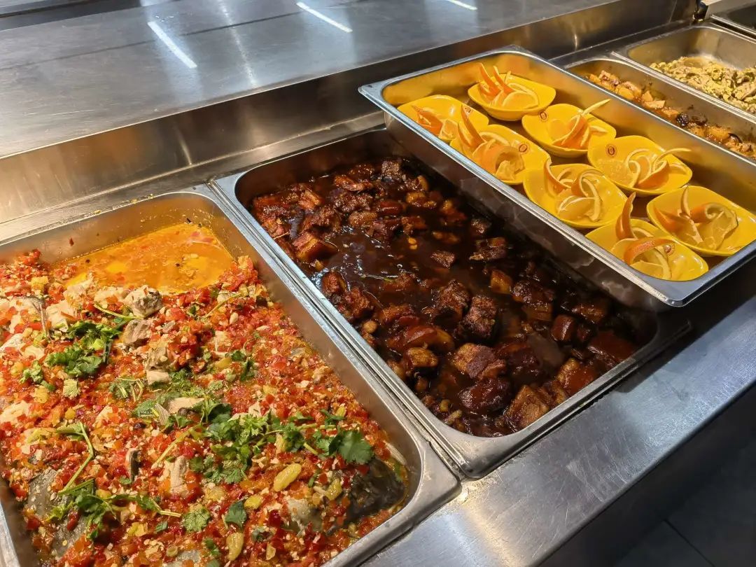 红烧肉、萝卜牛腩、剁椒鱼块、清炒菠菜、罗宋汤、哈密瓜等丰盛的菜品摆满了窗口,为留校学生们带来美味的惊喜。