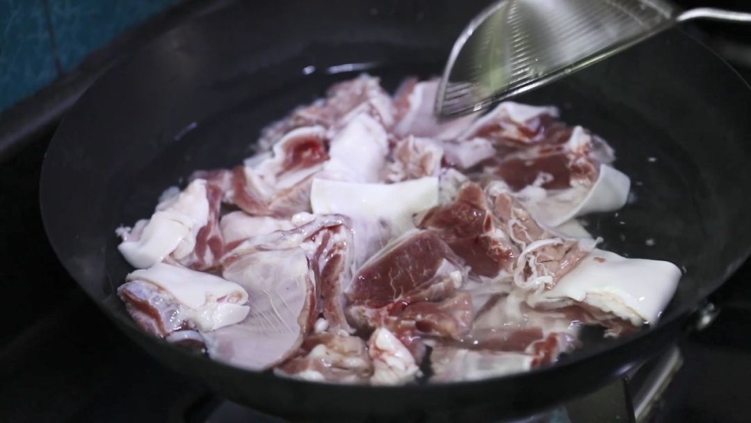 切好的羊肉用热水焯一焯,去除血水和羊肉多余的油渍,焯水的期间撇去表面的浮沫,等羊肉变颜色之后捞出来。再用干净的锅热油,然后拿焯好的羊肉与姜片、辣椒、八角一道,煸出香味。