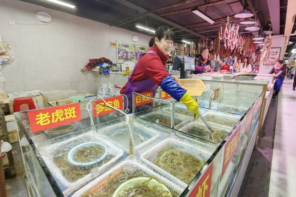 “干这行,一年四季不休息!过年了,准备早点打烊,一家子烧几个好菜。”在昌里东路上的菜场“浦商邻里荟云莲店”,水产经营户陶进芝一边打捞着鱼虾一边向记者盘算着春节安排。