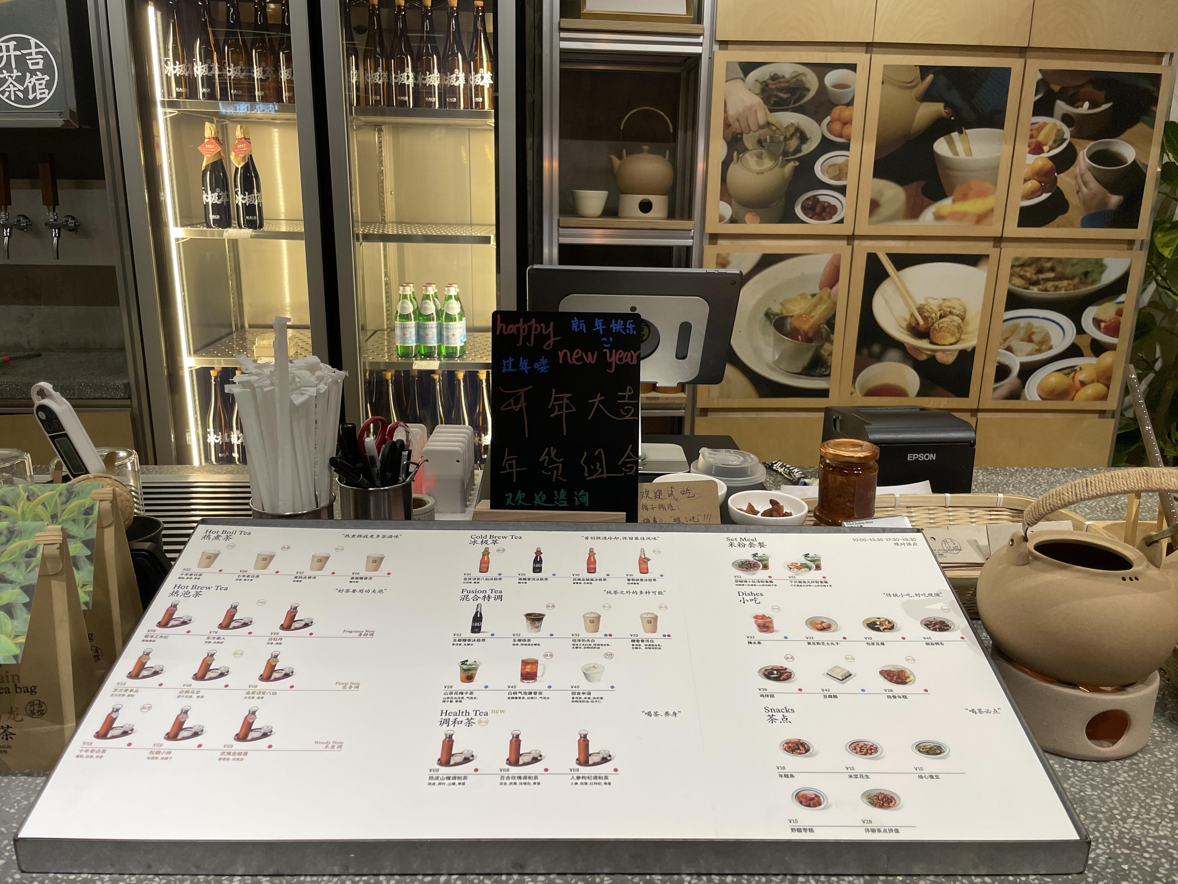 打开“开吉”的菜单,主要分为茶和小吃两个部分,一份茶加一份小吃,价格上相当于在咖啡馆点了一杯美式和一块蛋糕。茶以热煮茶、热泡茶以及冰极萃、调和茶为主,客户可以选择店员制作的“一杯”,直接享受喝茶的乐趣,可以选择“一席”,自由发挥,泡出自己最喜欢的独有口味。小吃部分,除了改良后的黄豆粉芝士丸子、包浆豆腐等十余种小吃,还有当前大火的“排骨年糕”。