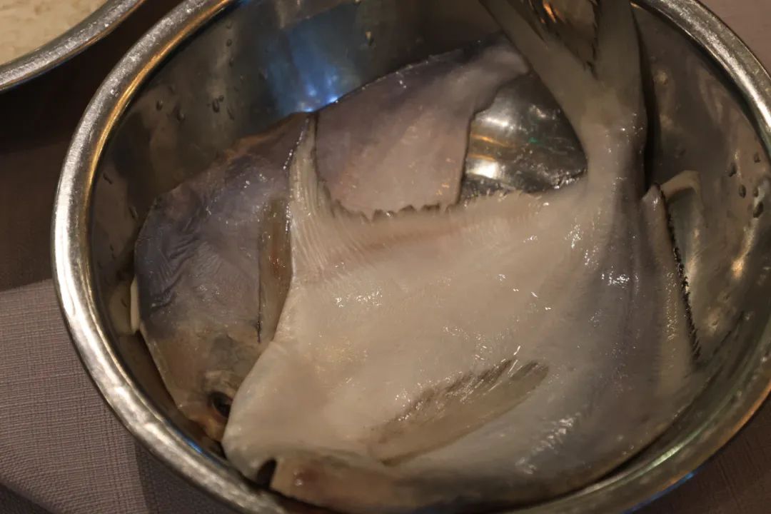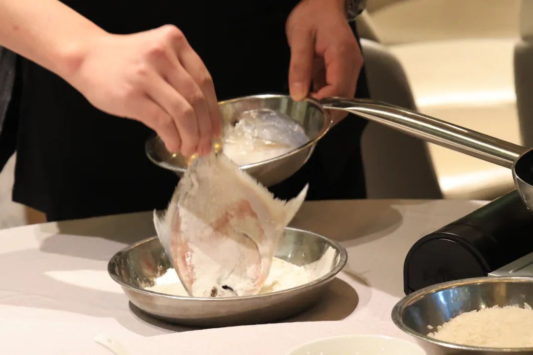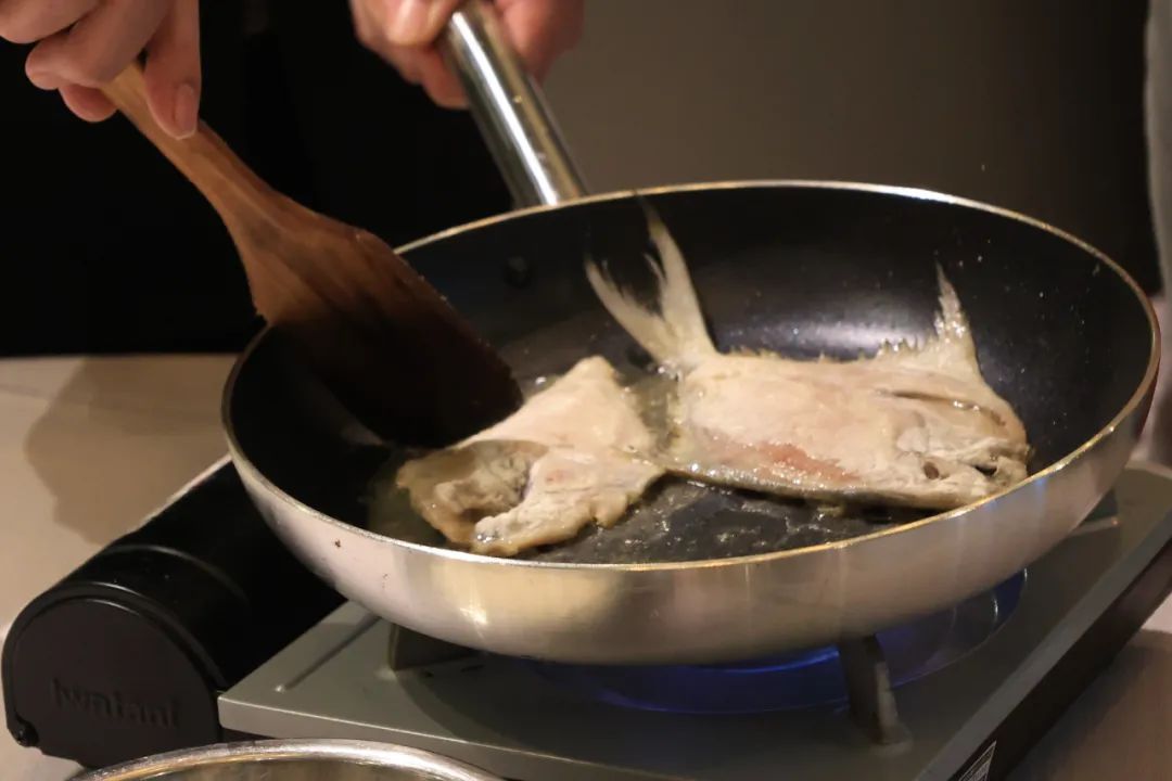 1. 冷油冷锅,鲳鱼蘸上面粉,用油慢慢煎鲳鱼,将鲳鱼的两面煎至金黄。