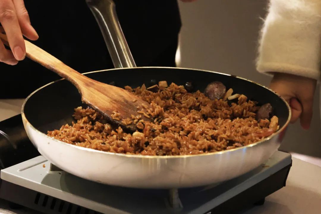 2. 腊肉、香肠、香菇、虾干同时加入,在锅中翻炒,炒出香味后,直接把焖好的泰国香米加入其中翻炒。焖好的米饭,要提前加入蚝油,味精、鸡精、老抽上色炒至均匀,最后加入葱花翻炒均匀后出锅。
