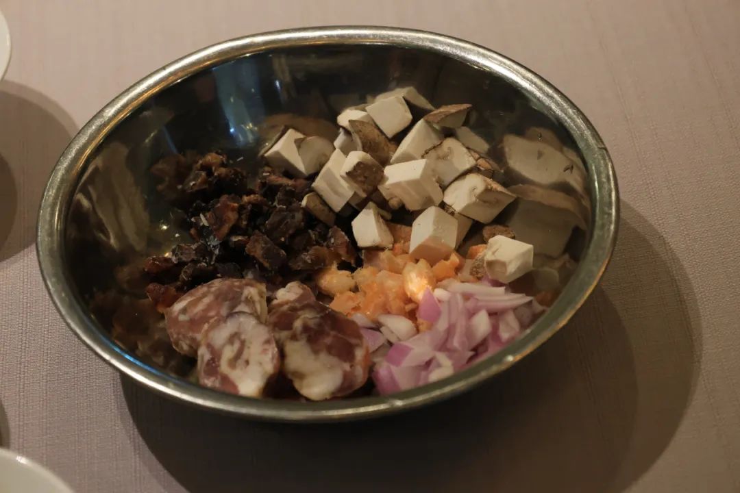 配料:香肠 腊肉 香菇 虾干 洋葱 味精 蚝油 老抽 鸡精 食用油 面粉 葱花
