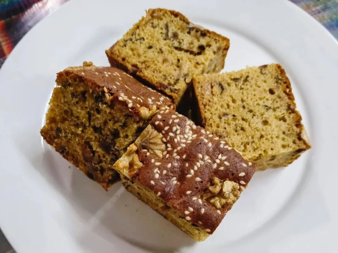 面糊倒入底部垫了硅油纸的吐司盒模具,表面撒上核桃仁、白芝麻。放入预热后的烤箱,180℃烤1小时左右即可。