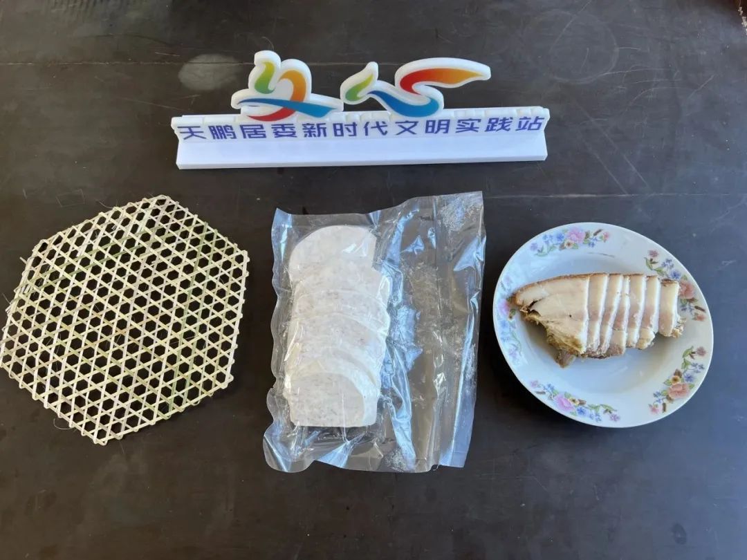 准备食材:荔浦芋头、走油肉、竹垫、南乳汁、生抽、老抽等