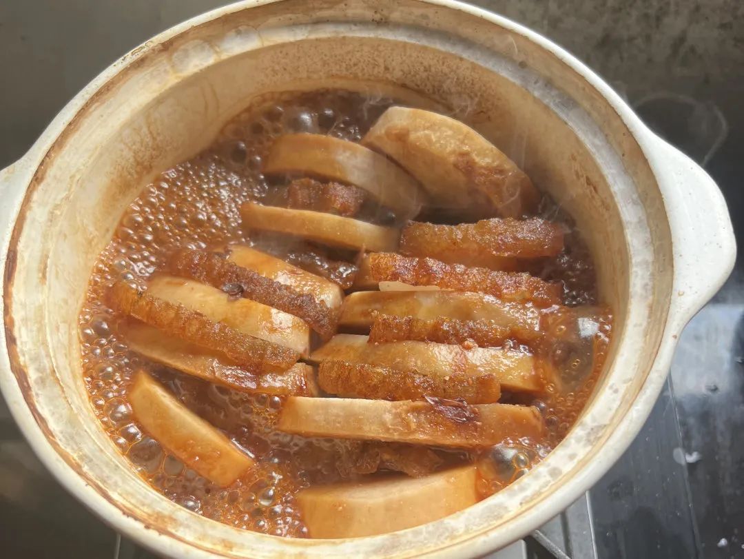 随后加入适量清水,大火烹煮约15分钟后加入少许糖提鲜,转小火收汁。待汤汁收浓,再根据口味加入少许盐调味,最后撒上葱花。