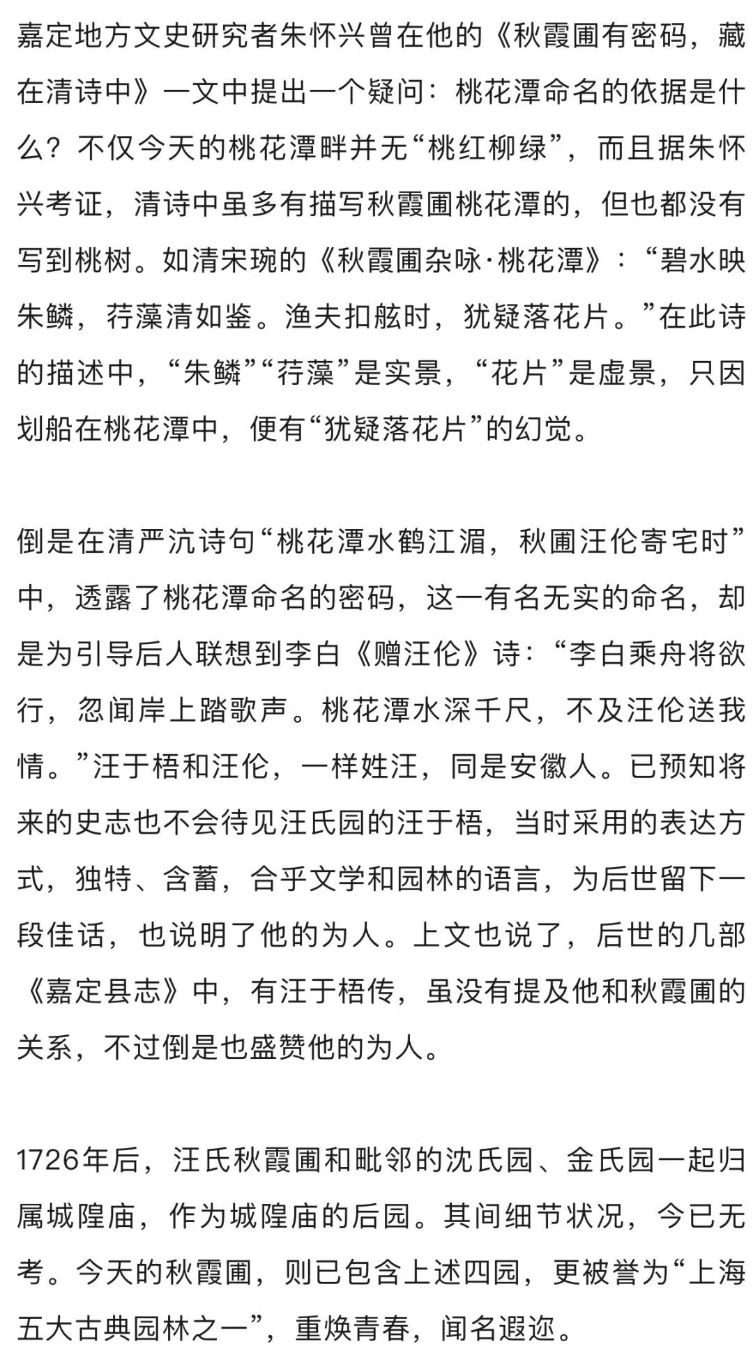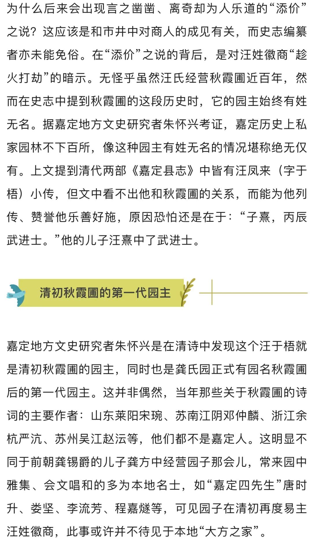 其一,关于龚氏宅园何时售于汪姓徽商,据查最早记载此事的嘉庆《嘉定县志》卷八“第宅园亭”里,只说龚锡爵成年后,从收养他的舅舅沈兆家返乡时,“其城隍庙西故宅已售一徽商”,并未说明售出时间和经手人。此后史志传记中的相关说法,则是时隔越久情节越丰,益显“演绎”特征。据此可知,所谓汪姓徽商在龚家遭难时“趁火打劫”压价购入龚氏宅园的推测未经实锤。