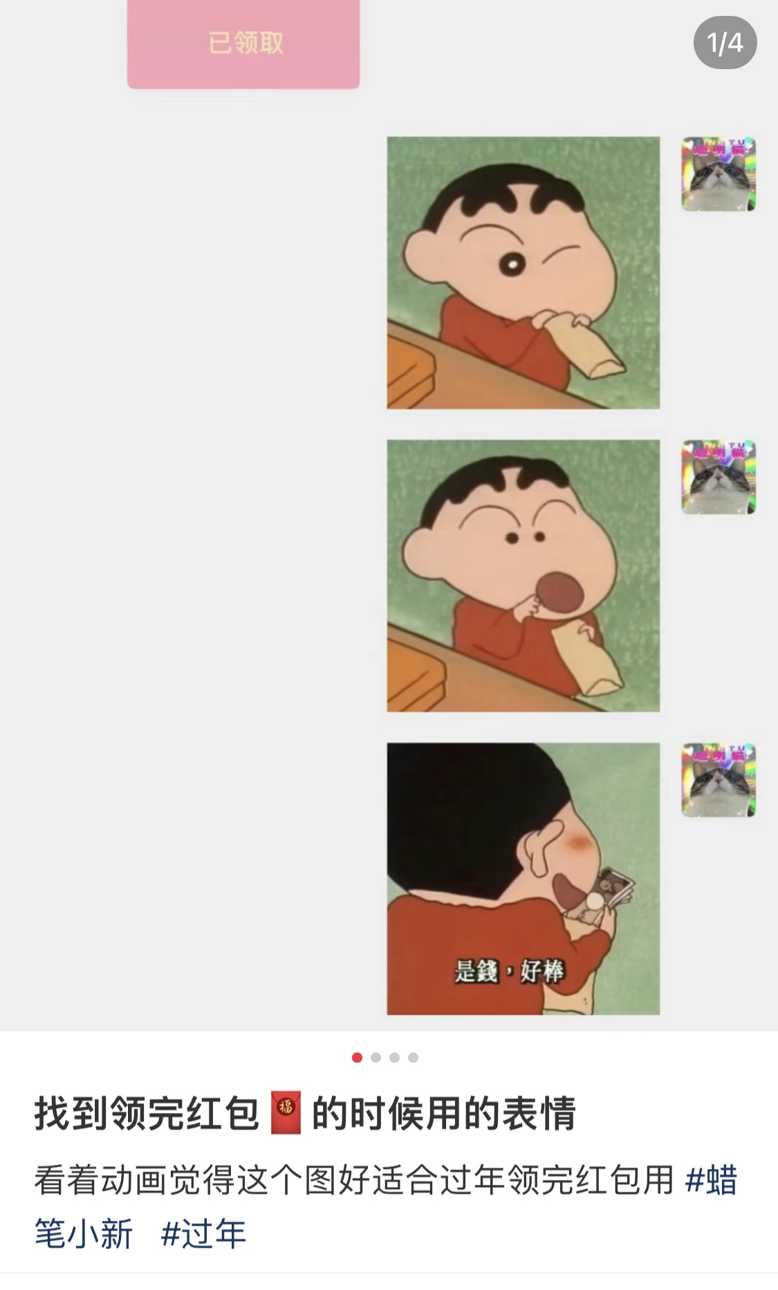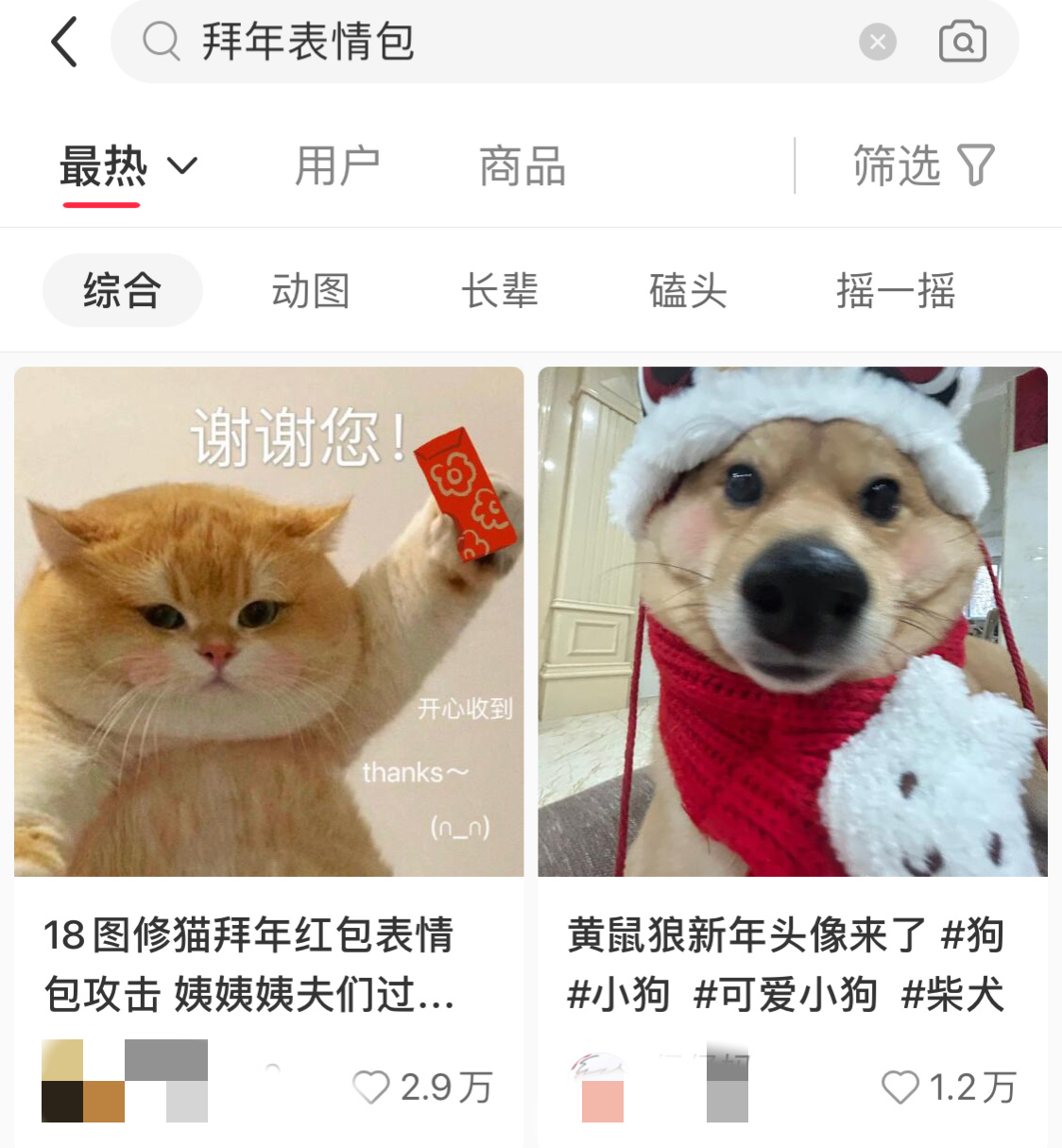 还有一些年轻人热衷于搜集各种实用的拜年表情包,有些是卡通IP的,有些是小猫小狗等动物的。一位宠物博主用自己家小猫的照片做了18张拜年表情包,得到了1万多网友的点赞。