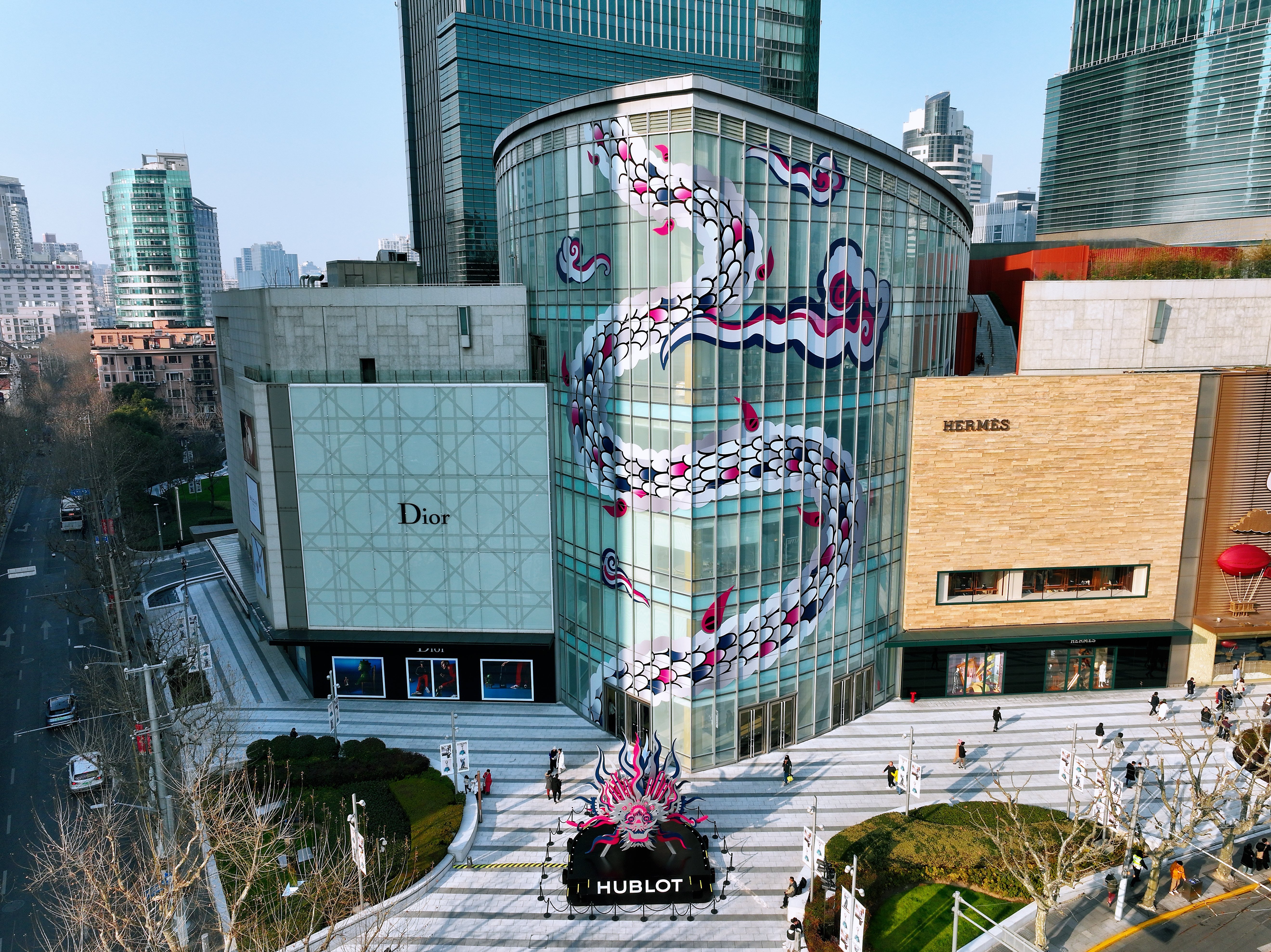在上海,传统文化搭载着龙装置、龙玩偶、龙灯、龙主题非遗创作等文创产品“飞入寻常百姓家”,在静安,一条光影“巨龙”在南京西路商圈腾飞,“闪亮千亿商圈 光影SHOW新春”主题光影活动吸引了许多市民、游客前来打卡拍照。