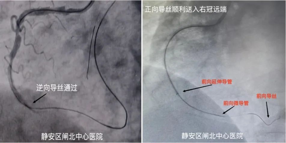 按照既定方案及时调整治疗策略,启动逆向介入治疗。由于间隔支较迂曲,逆向导丝通过困难,心内科医疗团队经过不断细致操作,最终逆向导丝通过了顺利进入前向微导管内,并顺利送入另一根sion导丝通过前向微导管进入右冠后将支。