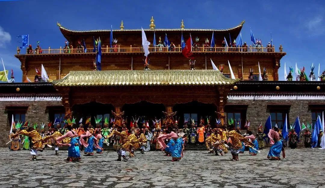 在这里你可以欣赏场面宏大的国家非物质文化遗产马背藏戏,聆听格萨尔说唱艺人精彩的表演,围着篝火跳起欢快的锅庄舞。