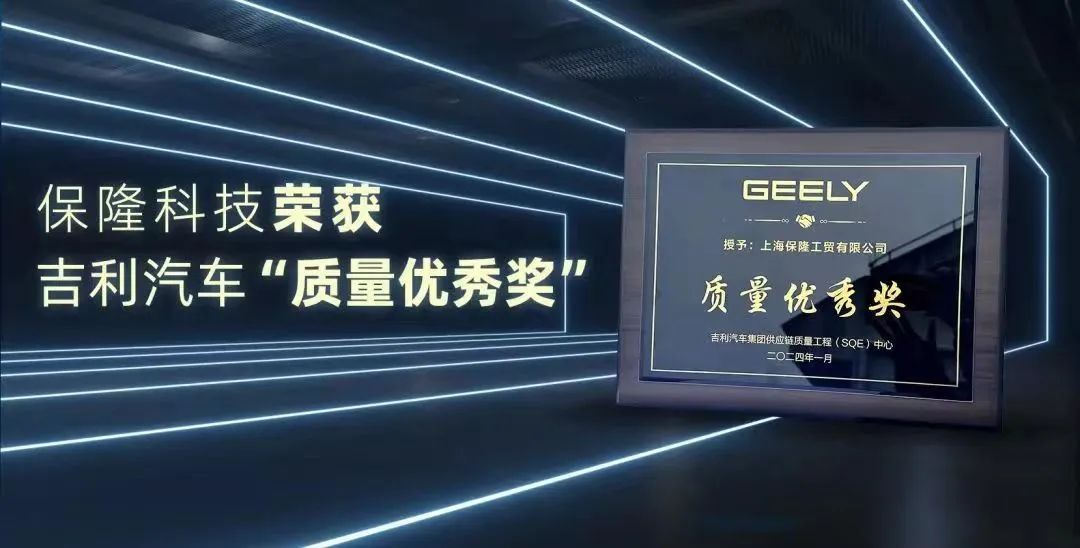 2月2日,上海保隆汽车科技股份有限公司荣获吉利汽车2023年度“质量优秀奖”,这是吉利汽车对保隆科技优秀产品质量和供货业绩的高度肯定。