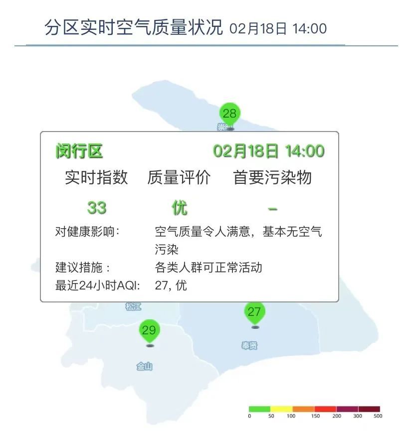 2月18日14时,闵行区AQI为33,优。昨天AQI为27,优。空气质量令人满意,基本无空气污染。各类人群可正常活动。