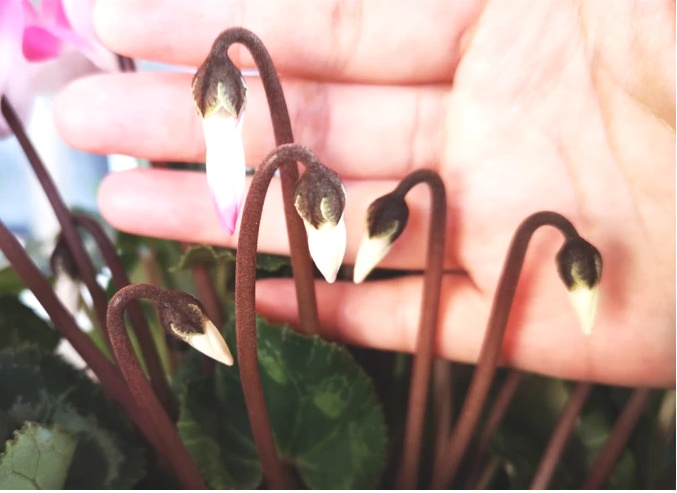 花瓣形如兔耳的仙客来广受市民的喜爱,每一片仙客来的叶柄基部都会冒出一支花蕾,热热闹闹地持续开放。为了给花朵提供充足的营养,需要每2周加餐磷钾元素肥料。充足的肥力保障能让它的花花一直开到5月下旬。