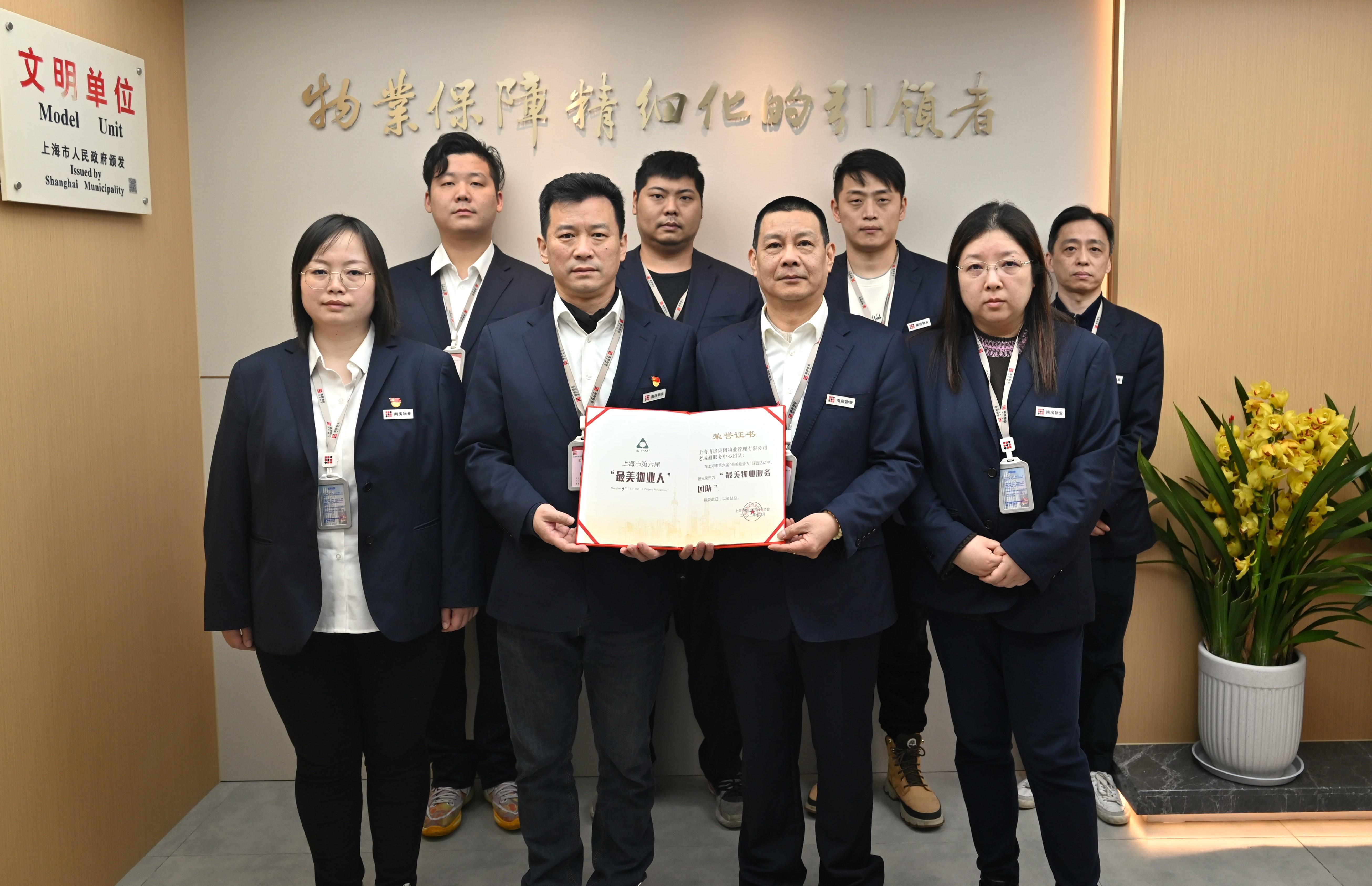 此外,上海金外滩集团房屋维修应急管理有限公司、上海南房集团物业管理有限公司、黄浦区(北部) 962121物业服务呼叫中心、老城厢服务中心团队、上海复欣物业管理发展有限公司、上海海鸿福船物业管理有限公司还分别荣获了“最美物业服务团队”称号。他们团结一致、勇挑重担,在应急抢险、公房管理、热线服务、社区管理等工作中彰显出“最美物业服务团队”的至臻服务。