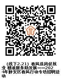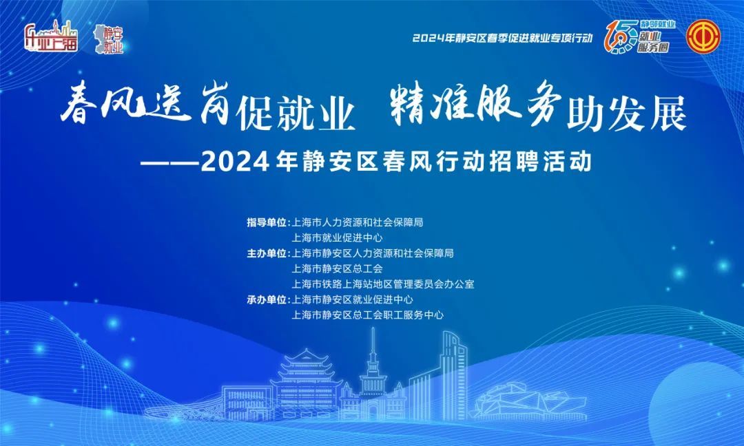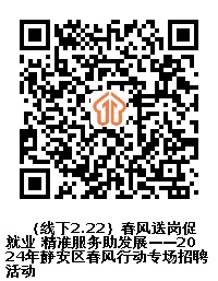 最是一年春好处,迎春复产不待歇。 2024年静安区春风行动携百余企业 登陆上海站北广场, 期待您的到来。 活动时间 2024年2月21日(周三) 13:30—15:30 2024年2月22日(周四) 9:30—11:30 活动地点 上海铁路火车站北广场站前东侧空地 指导单位 上海市人力资源和社会保障局 上海市就业促进中心 主办单位 上海市静安区人力资源和社会保障局 上海市静安区总工会 上海市铁路上海站地区管理委员会办公室 承办单位 上海市静安区就业促进中心 上海市静安区总工会职工服务中心 2月21日下午岗位详情如下 (所有招聘单位及岗位信息以招聘会现场为准) 2月22日上午岗位详情如下 (所有招聘单位及岗位信息以招聘会现场为准) 若您有应聘意向,无法现场应聘, 请扫描以下二维码在线投递简历。 企业与岗位以实际到场情况为准, 招聘会现场还有 乐业上海就业服务专家志愿者 提供就业咨询服务。 2月21日专家 2月22日专家