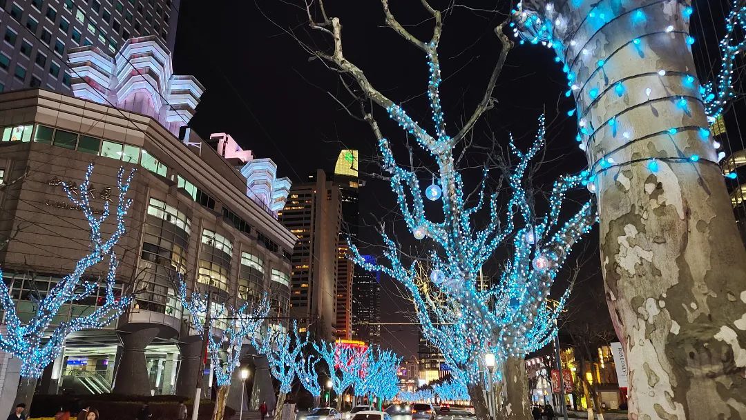晚上6点多,夜幕逐渐降临,南京西路商圈一个个地标性建筑的光影点位串联而起,化身为一幅流光溢彩的画卷。