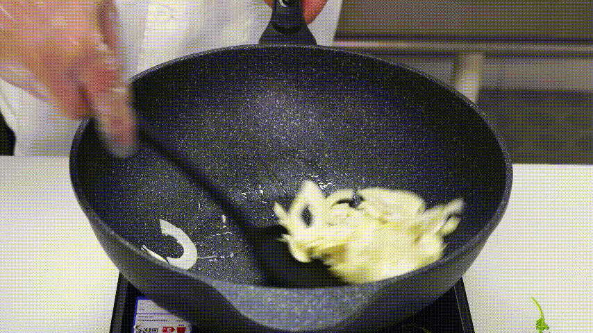 3.开火热锅冷油,油烧热后放入姜末煸香,放入春笋片炒至变色后加盐调味。