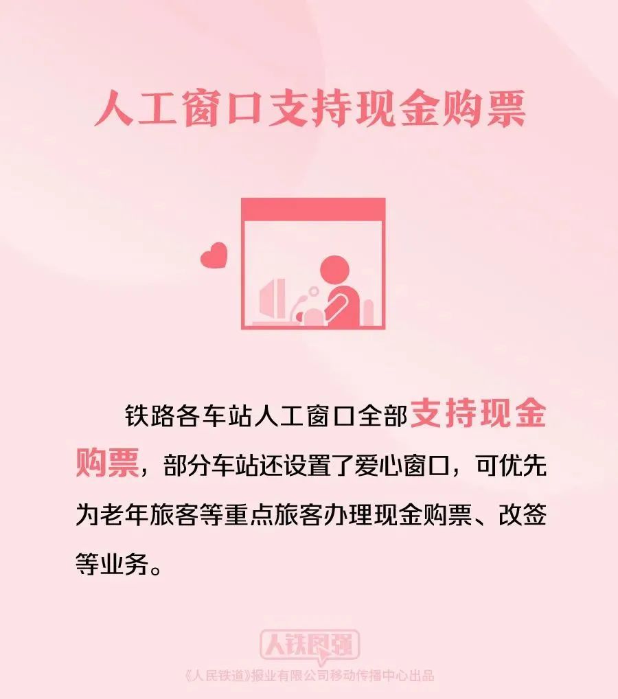 铁路各车站人工窗口全部支持现金购票,部分车站还设置了爱心窗口,可优先为老年旅客等重点旅客办理现金购票、改签等业务。