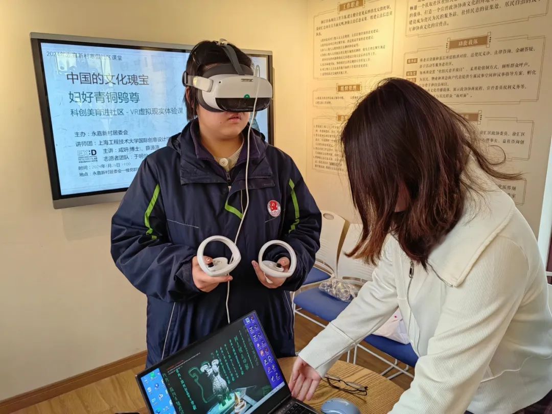 徐汇区天平街道永嘉新村党群服务站日前来了一场特别的美育科创活动。来自上海工程技术大学国际创意设计学院(简称:工技大国创学院)的志愿者讲师团,将中国商代青铜器文物“妇好鸮尊”与现代VR科技结合,为社区的孩子们带来了一次前所未有的文化体验。