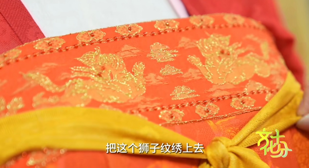 为了对应歌词“雄狮过天山”,设计师在设计唐代襦裙时选用法门寺地宫出土的狮子纹,并用手绣的方式将它绣上去。“大概用了十多种布料打样,用了二十多天,最后做了一个虚实相结合的狮子。”