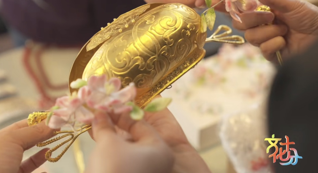 这套造型的发饰参考安庆市棋盘山出土文物复原的金冠,江西德安、安徽芜湖等地出土文物复原的发钗,点缀以当时流行的绒花饰品,兼顾历史传承性与美观性。
