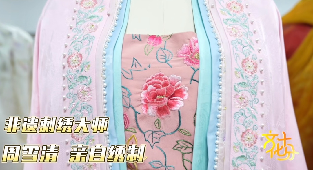 此外,曾在张艺谋导演的《英雄》《十面埋伏》等作品中担任服装染色师的北京服装学院专家张承来亲自负责染色,抹胸由非遗苏绣大师周雪清亲自绣制。
