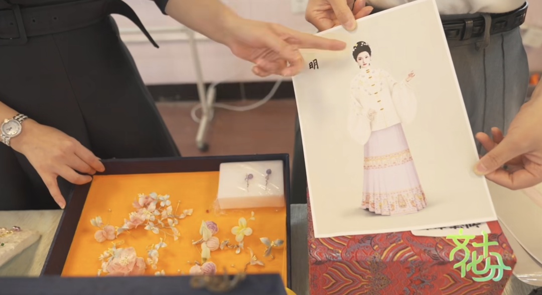 这套服饰搭配的发型参考了明代《百美图卷》,配以瓜果、蝴蝶、花卉等样式的非遗绒花装饰,与上衣的刺绣纹样交相辉映,美不胜收。