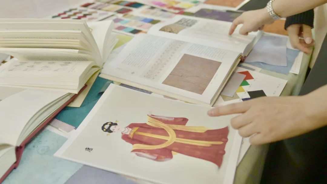 《年锦》造型设计张婷介绍,每个设计图都会改几十版,用百余种颜色、十几种布料打样。在反复修改纹样、无数次上色实验后,设计师最终定稿,交给织锦厂定制织造。