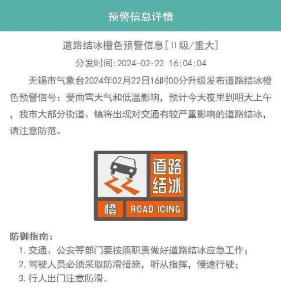 目前,对于这种突如其来的极端天气,无锡市气象台02月22日16时00分升级发布道路结冰橙色预警信号:受雨雪天气和低温影响预计2月22日夜里到2月23日上午无锡市大部分街道、镇将出现对交通有较严重影响的道路结冰。