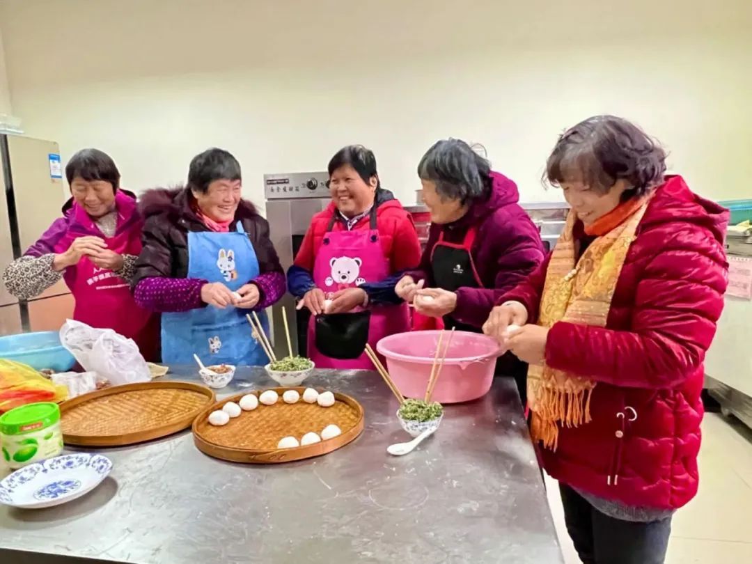 “包汤圆和面一定要用开水,这样揉出来的面团更有韧劲。”倒面粉、加水、和面、包馅……村民们围在台面前热火朝天地包起汤圆。“长条状的是红枣和豆沙馅的甜口汤圆,圆的是荠菜肉馅。汤圆要有甜有咸,生活才能甜甜蜜蜜、有滋有味。”徐行镇小庙村村民陆秀芬边介绍,边熟练地往面团剂子里填馅。
