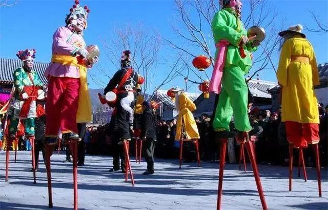 高跷本属中国古代百戏之一种,早在春秋时已经出现。踩高跷的人往往装扮戏曲折子,身着戏装,浓妆艳抹,且歌且舞。