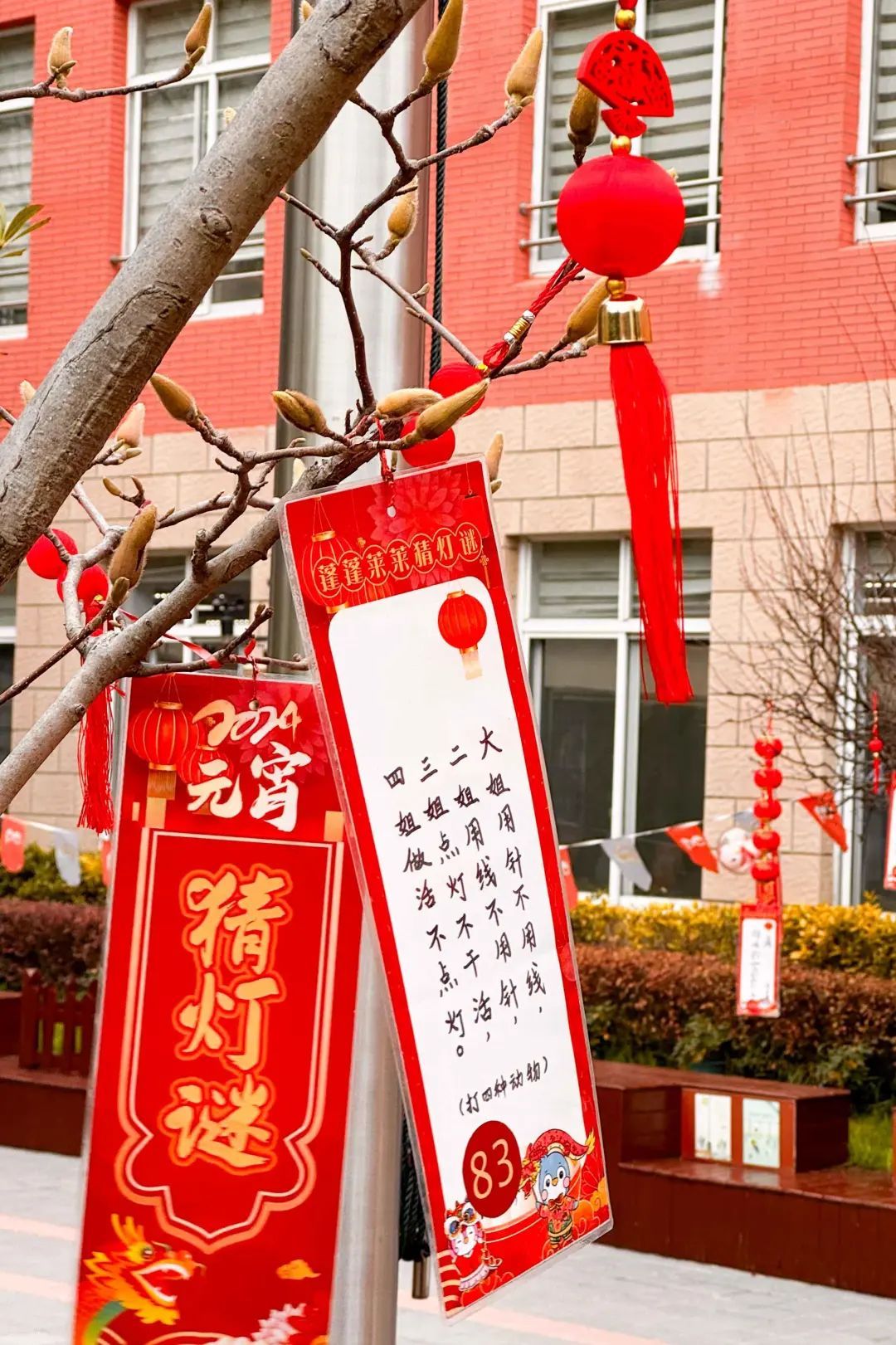 赏灯笼、猜灯谜是元宵节特有的传统习俗。学生利用课间、午休时间,纷纷来到校园里,站在红灯笼下抬头看灯谜,认真思索;低头写谜底,书写端正,参与热情高涨,兴致盎然。