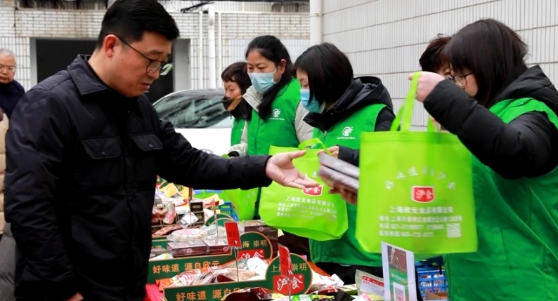 2月23日,“崇明好物”欣元食品走进区政府机关食堂,进行展示展销活动,各式精美食品吸引众多午间用餐的上班族目光。