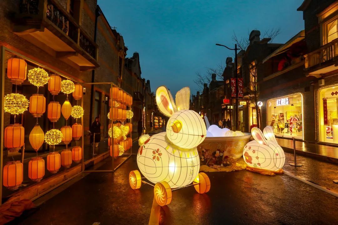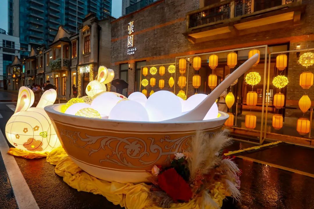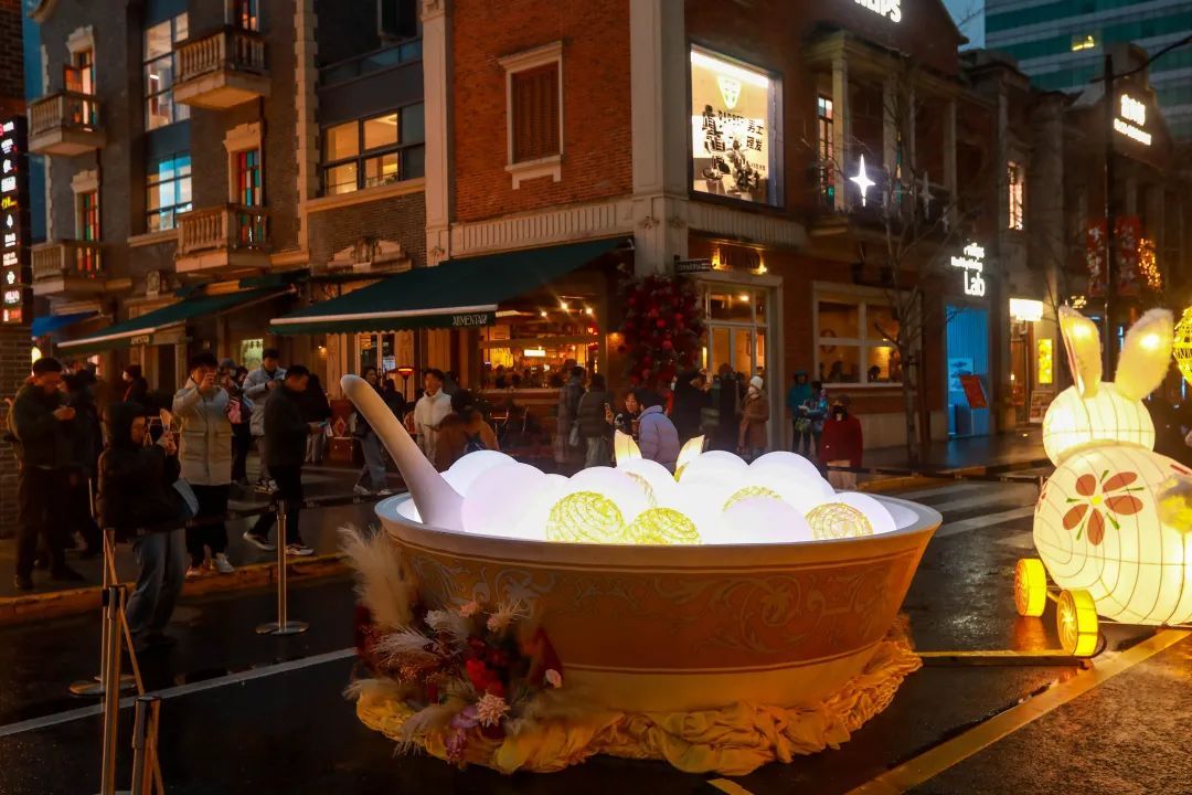 华灯初上时,传统的灯笼与现代的彩灯在茂名北路限时步行街交汇,形成错落有致、光影斑斓的街景。步行街中央,可爱的兔灯正“拉着”一碗超大容量的元宵,欢迎大家一同品尝。碗中的“白胖子”们个个都是圆滚滚的,透着让人忍不住想要上一口的美味诱惑。