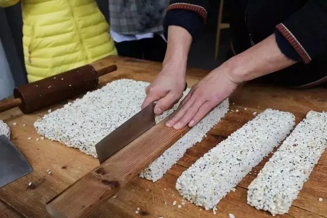 桑木桌上放一块案板,抹上菜油,四周用木框固定好,盛入滚热的炒米糖,用木板或空酒瓶使劲来回滚平、压实。磨得锋利的菜刀也抹上菜油,等到糖半冷不热的时候,祖父拿出模子,横三刀竖两刀用刀,切成小块方形,手起刀落,动作迅疾,简直是一幅绝美的风俗画。