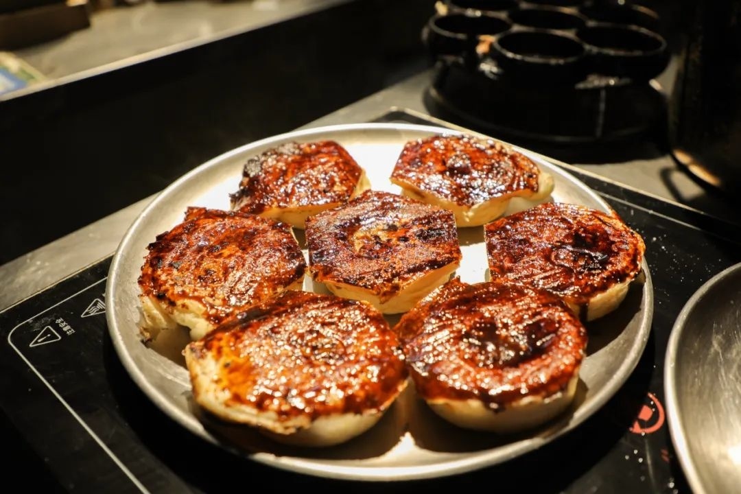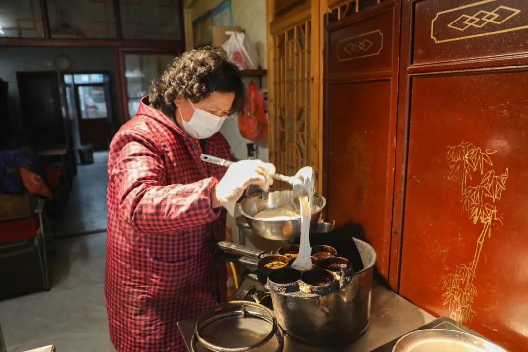 “好嘞!”在顾客的招呼声中,陈小妹手法娴熟地用刷子给模具内壁刷上一层水油,倒入面浆、填充豆沙、放上猪油……烘烤片刻后,再将撒上一层白糖的铁板贴在糕面上,待铁板上溢出糖浆,即可出锅。做一炉海棠糕仅需5分钟,整个过程行云流水。