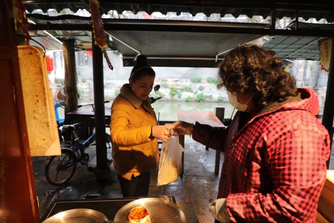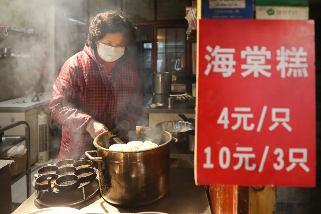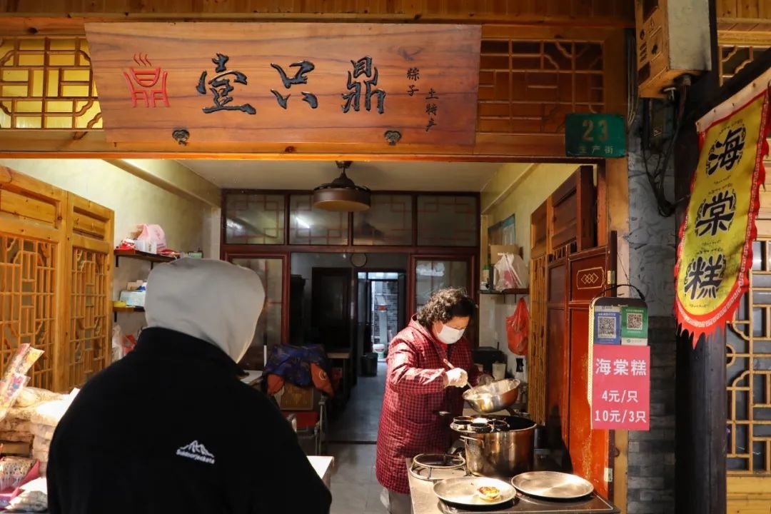 店门口的木质门头上刻着“壹只鼎”三个大字,正如同上海话里“一只鼎”所表达的意思,小店的海棠糕堪称一绝,深受外地游客和枫泾本地人的喜爱。“今年春节,上海都市频道来我们这拍摄了海棠糕,我们有幸登上了元宵节的晚间栏目。”当谈及上电视,店主陈小妹的脸上满是自豪,“每逢节假日,是店里海棠糕卖得最好的时候,得两个人才能忙活得过来,最多的时候一天能卖出600块左右。”