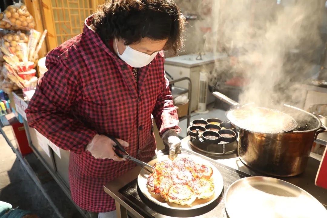 刚刚脱模的海棠糕,形如盛开的海棠花,色如琥珀,香气四溢。“陈阿姨做的海棠糕味道好极了,价格还实惠,我们全家都特别喜欢吃。外层的焦糖香脆,内里的豆沙绵甜,很符合我们的口味。”顾客宋女士说道。